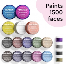 Professzionális SNAZAROO arc- és testfestő készlet gazdag tartalommal iskolák, szakkörök és nagy rendezvények számára. Tartós, élénk és telített színeket kínál, amelyek biztonságosak és nem mérgezők, érzékeny bőrre is alkalmasak. Könnyen leöblíthetők vízzel és szappannal, és legalább 1500 arcfestésre elegendők.
