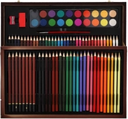 Fedezze fel a teljes művészeti felszerelést, ideális kis és nagy művészeknek. Ez a praktikus készlet elegáns fa bőröndben mindent kínál, ami szükséges a festéshez és rajzoláshoz, beleértve a színes ceruzákat, hegyezőt, radírt és vízfestéket, összesen 91 darabot.