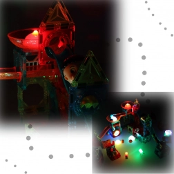 A golyók mozgása aktiválja a fényt, és a megvilágított elemekkel együtt lebilincselő fényjátékot hoz létre, amely motiválja a gyerekeket a további építésre és kísérletezésre.