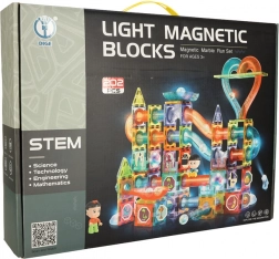 Ez a kreatív STEM építőkészlet kombinálja a mágneses elemeket és az átlátszó golyópálya-síneket. A világító elemek és reflektorok életre keltik minden konstrukció fényét, így a játék lenyűgöző fényhatássá válik – különösen szépen érvényesül sötétben. Az elemek tartós műanyagból készülnek, a mágneses kapcsolatok stabilitást adnak, az alagútelemek pedig fixen illeszkednek.