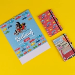 A kemény borítás megóvja a lapokat a sérülésektől, az elasztikus gumiszalag pedig útközben is szorosan zárva tartja a füzetet.