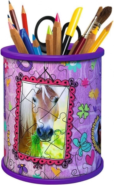 Fedezze fel a szórakoztató 3D puzzle-t, amely összeállítás után praktikus ceruzatartóvá, ecsettartóvá vagy kozmetikai szervezővé változik. A speciálisan ívelt, kiváló minőségű RAVENSBURGER műanyag elemek pontos illeszkedést biztosítanak és ragasztó nélkül is erős szerkezetet adnak. A ló motívum minden állatkedvelőt elragadtat, és egyedi stílust kölcsönöz az íróasztalnak.