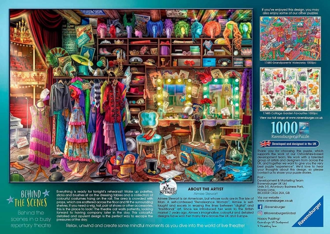 A Ravensburger A színfalak mögött puzzle kiváló minőségű kidolgozást képvisel, amely minden puzzle-rajongónak örömet okoz. A puzzle kirakása szórakoztató módja lehet a pihenésnek, miközben fejleszti a logikát és koncentrációt. A 70 x 50 cm méreteknek köszönhetően lenyűgöző vizuális élményt nyújt a kép.