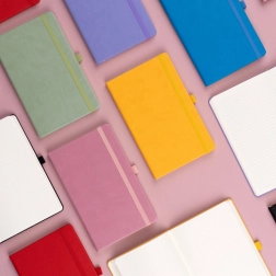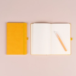 Praktikus és könnyű pontozott jegyzetfüzet trendi sárga színben, finom textúrájú felülettel, amelyre a vállalat logója is dombornyomással elhelyezhető. A jegyzetfüzet kemény kötésű, lekerekített sarkokkal, tollhurokkal, gumipánttal és textil könyvjelzővel rendelkezik. A pontok 5 mm-esek, minőségi sárga papíron.