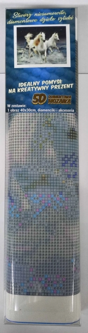 A gyémántfestés egy egyszerű és szórakoztató kreatív tevékenység, amely során applikációs tollal apró kövecskéket helyez a mintával előnyomott vászonra. A vágtázó deresek motívuma csillogó hatásával tűnik ki, és bármely belső tér díszévé válik. Nem szükséges semmilyen művészi készség – elég a színkódot követni.