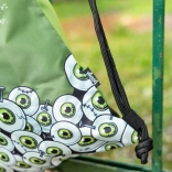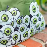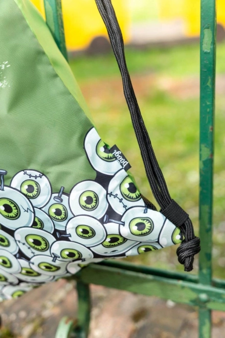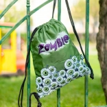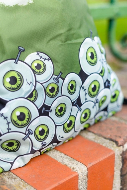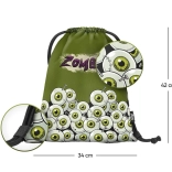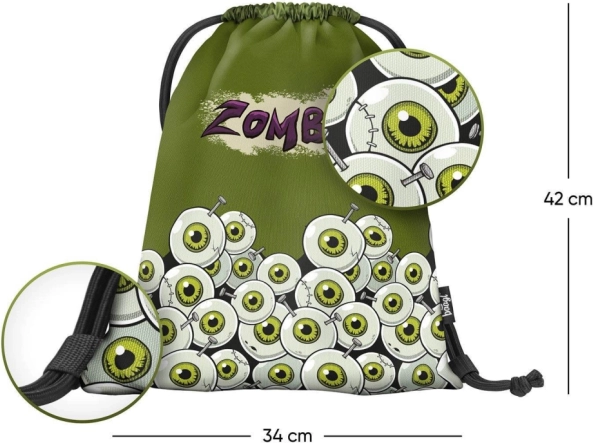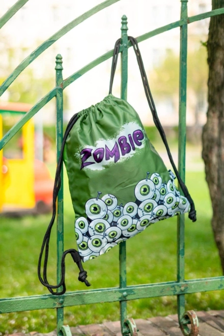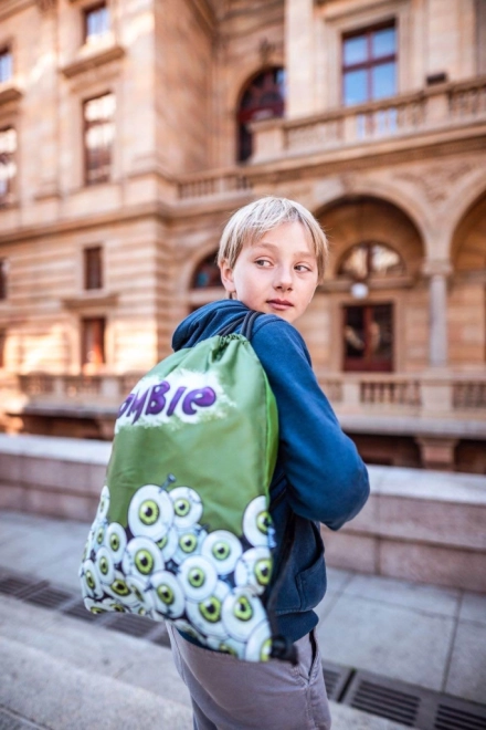 A hátizsák zöld rajzolt szemekkel és 'Zombi' felirattal van díszítve, ami vonzza a tekintetet és kiemeli az egyediséget.