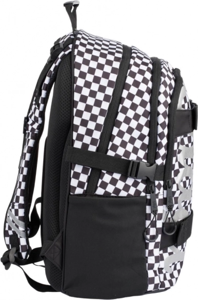 Három különálló rekesz, rugalmas zsebek és pántok a gördeszka rögzítéséhez a praktikus tárolásért.