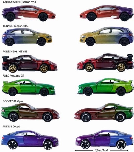 Válasszon a következő modellek közül: PORSCHE 911 GT3 RS, LAMBORGHINI HURACÁN, AUDI S5 COUPÉ, FORD MUSTANG GT, DODGE SRT VIPER és RENAULT MEGANE R.S. – mindegyik vonzó árnyalatokkal és Color Changers hatással.