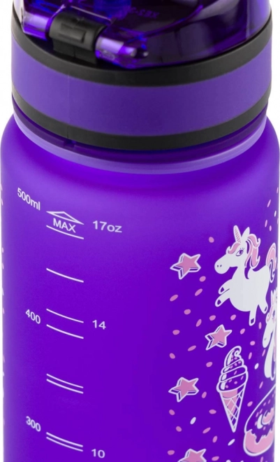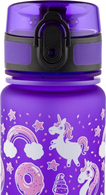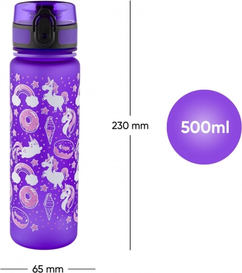 A palack aranyos egyszarvú motívumokkal díszített, amelyek minden gyermek számára tetszetős. Játékos megjelenést ötvöz élénk színekkel.
