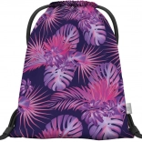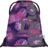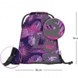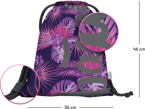 A zsák vonzó trópusi mintával rendelkezik rózsaszín és lila tónusokban, amely vonzza a figyelmet.