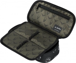 A belső zsebek és rugalmas pántok lehetővé teszik az íróeszközök könnyű elrendezését, miközben a szárnyas lények motívumával díszített zöld bélés egyedi varázst kölcsönöz.