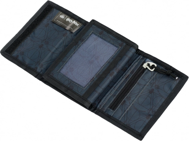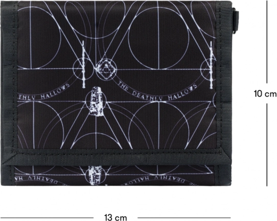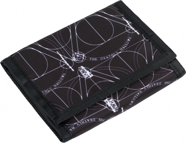 A pénztárca Halál ereklyéi motívummal díszített, ami ellenállhatatlan vonzerő a varázsló sorozat rajongóinak.