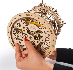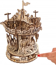 Szerezzen örömet magának egy elegáns, minőségi rétegelt lemezből készült körhintával, amely a nosztalgiát okos mechanikával ötvözi. A gumis felhúzó hajtásnak köszönhetően a középső oszlop és a tető ellentétes irányba forog, ezáltal nagy sebesség optikai illúzióját kelti. A lovacskák finoman emelkednek és süllyednek, a körhinta felett pedig apró madarak köröznek – mindez a nyitott dizájnnak hála szépen látható.