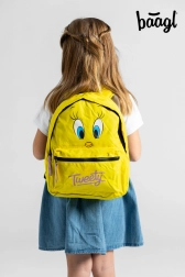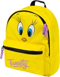 A hátizsák élénksárga színe és Tweety motívuma vonzó a kisgyermekek számára.