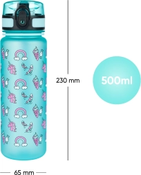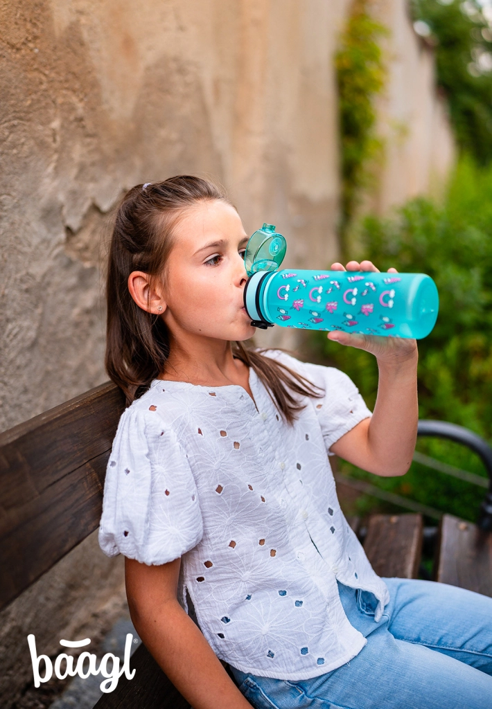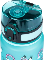Cuki, 500 ml-es tritán kulacs unikornis és szivárvány mintákkal – ideális iskolába, kirándulásokra és sporthoz. Van zárható felpattanó tető a kifolyás ellen, szívószálas csőr a könnyű iváshoz és praktikus csuklópánt. Tanúsított, BPA-mentes tritán nem veszi át a szagokat vagy ízeket, és forró italokhoz is biztonságos.