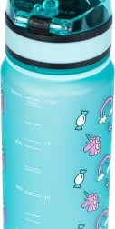 Ez az 500 ml-es gyerek kulacs biztonságos tritán anyagot ötvöz játékos unikornis, szivárvány és nyalóka dizájnnal. A zárható felpattanó tetőnek köszönhetően nem folyik ki a hátizsákban, a praktikus pánt pedig megkönnyíti a hordozást a kis kezeknek. Belül szűrőbetét található, amely felfogja a gyümölcsöt vagy a gyógynövényeket – tökéletes házi limonádékhoz és teákhoz.