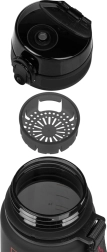 A biztonsági zárral ellátott zárható kupak megakadályozza a véletlen kinyílást a táskában, a flip-top mechanizmus pedig lehetővé teszi a gyors, egykezes ivást. A kivehető szűrő gyümölcsös limonádékhoz vagy szálas teákhoz használható – az anyag forró italokhoz is alkalmas. A hordozást kényelmes pánt segíti.