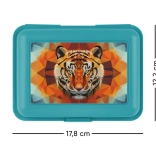 Türkiz műanyag doboz színes tigris grafikával a fedélen, amely stílust kölcsönöz minden ebédnek.