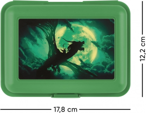 A telihold felé repülő sárkánnyal díszített design egyedi és vonzó megjelenést kölcsönöz az uzsonnás doboznak.