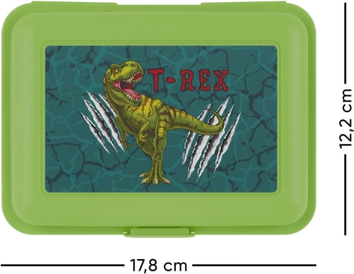 Stílusos T-Rex mintás uzsonnás doboz ideális kis és nagy kalandorok számára. Ez a zöld műanyag doboz praktikus egyzáró reteszszel és elválasztó rekesszel van felszerelve az étel könnyű rendezése érdekében. Könnyen hordozható és mindennapi használatra ideális.
