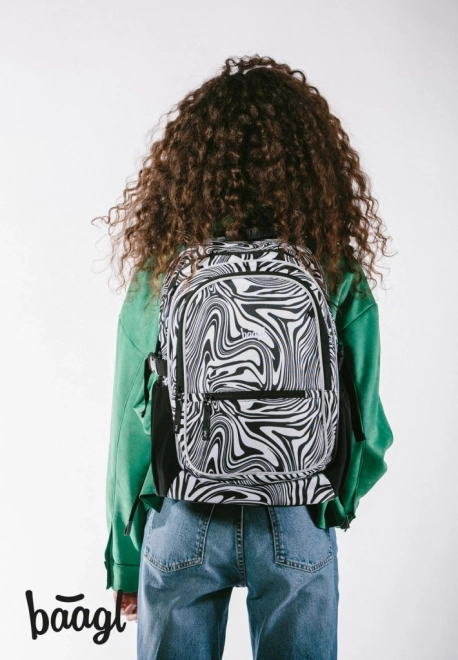 - Dizájn és funkcionalitás: modern fekete-fehér örvény/abstrakt minta, BAAGL függődísz, átgondolt zsebek és cipzárak a gyors rendszerezéshez.