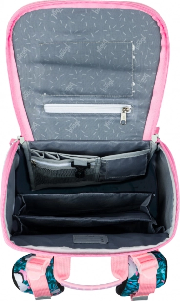 A felnyitható nyitórendszer megkönnyíti a használatot a padban. Belül átlátszó zseb található órarend számára, valamint gumipántos rendező a füzetek rögzítéséhez. Az oldalsó hálós zsebek ideálisak kulacs számára, az elülső, izolált zseb pedig védi az uzsonnát.
