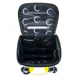 A praktikus felnyitható nyitás közvetlen hozzáférést ad a táska tartalmához a padról. Belül átlátszó zseb található az órarendnek és rendező rögzítő gumipánttal a tankönyvek és füzetek áttekinthető tárolásához. A szigetelt elülső zseb csattal óvja az uzsonnát, az oldalsó hálós zsebek pedig elférnek a kulacsnak. A tartós vízálló anyagok, a stabil alj és a fényvisszaverő elemek növelik az időtállóságot és a biztonságot az iskolába vezető úton.