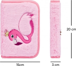 Az elülső oldalt koronás flamingó hímzés díszíti a puha, kellemes tapintású plüss felületen, amely egyedi kiegészítővé teszi a tolltartót.
