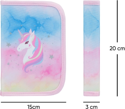 A BAAGL Rainbow Unicorn egyrekeszes tolltartó a bájos dizájnt praktikus tagolással ötvözi. Két belső fül rögzítőpántokkal átláthatóan a helyén tartja a ceruzákat, tollakat és apró iskolai kellékeket. A strapabíró textil és a minőségi cipzár hosszú élettartamot és biztonságos zárást garantál.