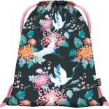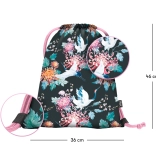 Fedezd fel a stílus és praktikusság tökéletes kombinációját madár mintás hátizsákunkkal. Ez a táska ideális személyes holmik vagy könnyű tárgyak szállítására, elegáns kivitelben madarak és virágok mintával, fekete háttérrel.