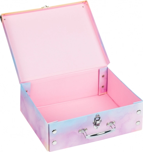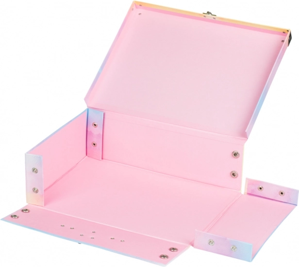 Stílusos és praktikus gyerek iskolai kufrik Rainbow Unicorn mintával a BAAGL-tól. A patentos, összecsukható kialakításnak köszönhetően könnyen összerakható és szétszedhető, a masszív, laminált papír fémmerevített sarkaival tartós használatot biztosít. A kényelmes fém fogantyú és a megbízható csat megkönnyíti a hordozást és a biztonságos zárást.