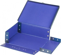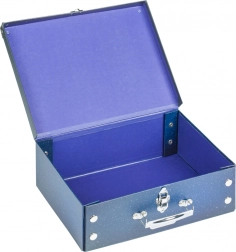 • Összecsukható kisbőrönd erős, laminált papírból, fémmel erősített sarkakkal.