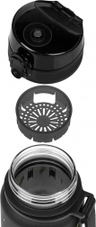 A praktikus biztonsági reteszes flip tető megakadályozza a véletlen kinyílást a táskában, és kényelmes egykezes ivást biztosít. Tartozék a kivehető szűrő gyümölcsös italokhoz vagy teához; az anyag forró italokhoz is megfelelő. Az integrált pánt megkönnyíti a hordozást, így a palack remek társ az iskolában, edzésen és utazáskor is.