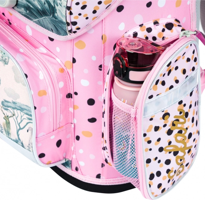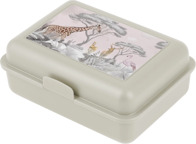 A uzsonnás doboz biztonságos ételtárolást kínál, praktikus zárral és osztólappal. Minden terméket trendi Safari minta díszít, ahol a pasztell színek vonzó illusztrációkkal keverednek.