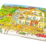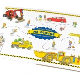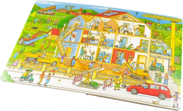 A városban állandóan történik valami – ásnak, javítanak, építenek és szépítenek. A gyerekek a lapokon teherautókat, betonkeverőket, markolókat, darukat vagy targoncákat kereshetnek, megismerik a mesterek munkáját és azt is, hogyan felügyel mindent a művezető és az építésvezető. Nem hiányzik az építész, a fotós vagy a kertész sem, és rengeteg figura saját minitörténetekkel. Ez az építkezésről szóló gyerekkönyv remek keresős (wimmel) könyv, amely természetes módon fejleszti a kifejezőkészséget és a figyelmet.