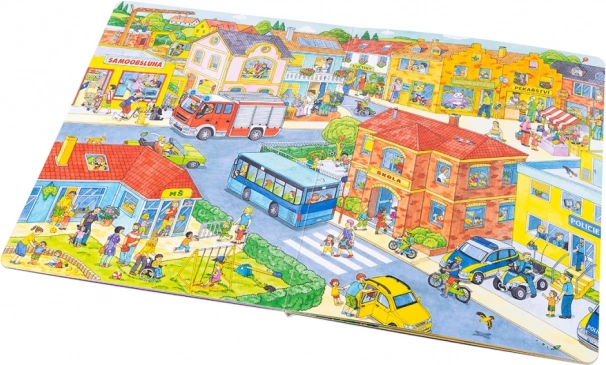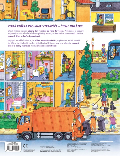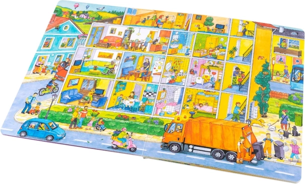 Ez a nagyformátumú könyv ideális közös olvasáshoz és meséléshez. A gyerekek megismerkednek azzal, mi történik a városban reggeltől estig – a kukások munkájától és a bevásárlástól kezdve az óvodán, az építkezésen, a tűzoltókon és a rendőrségen át egészen a délutáni parkbéli szórakozásig és a tóhoz vagy a farmra tett kirándulásokig. Minden oldal tele van beszélgetésre ösztönző ötletekkel és keresgélni való apró részletekkel.