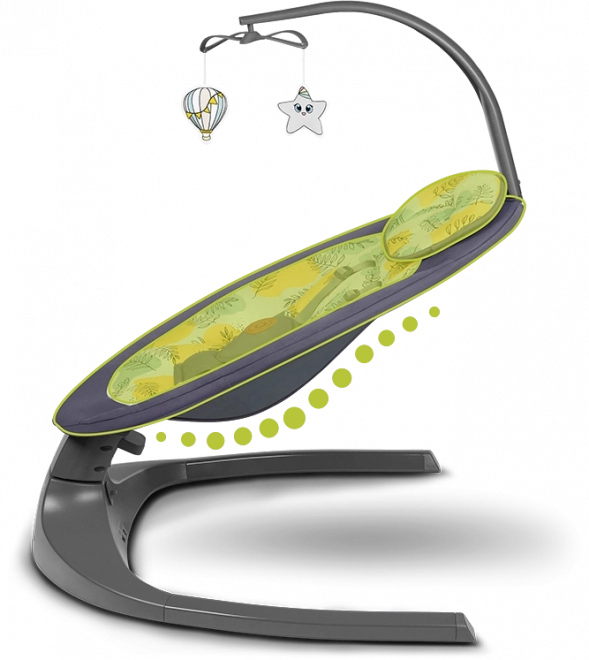 Az intuitív vezérlés a érintőpanelen vagy a mellékelt távirányítóval lehetővé teszi az 5 hintázási sebesség beállítását, az időzítő (8/15/30 perc) kiválasztását vagy a 12 megnyugtató dallam lejátszását. Az automatikus mozgásérzékelés akkor indítja a ringatást, amikor a gyermek mozgását érzékeli. A levehető játékhíd 2 játékkal fejleszti az érzékelést és szórakoztatja a kicsit.