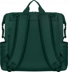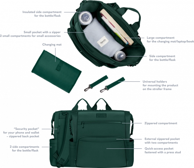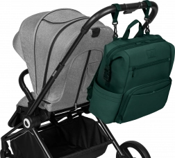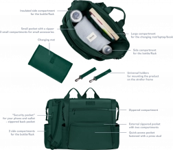 A hátizsák hordható háton, levehető univerzális pántokkal a babakocsihoz rögzíthető, vagy önálló táskaként is használható. A pelenkázó zseb táblagép vagy laptop rekeszként is szolgál, míg az oldalsó és belső zsebek mindent kéznél tartanak. A pántoknak köszönhetően csökkenthető a méret, így a hátizsák repülőn az ülés alá is befér.