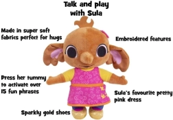 Angolul beszélő Sula elefánt mókás mondatokkal! A bájos plüssfigura tökéletes ölelgetésre. Sula, akárcsak Bing, imádja a kalandokat – legyen szó parkba tett kiruccanásról vagy egy nap az óvodában, a nyuszi tökéletes társ. Nyomd meg Sula pocakját, és hallgasd meg brit akcentusát. Sula puha anyagból készült, gyönyörű, hímzett részletekkel. Az elefánt kb. 30 cm magas. A termék nem cserélhető elemeket tartalmaz. Napi használat mellett az elemek átlagos élettartama kb. 6 hónap. Újszülött kortól ajánlott.