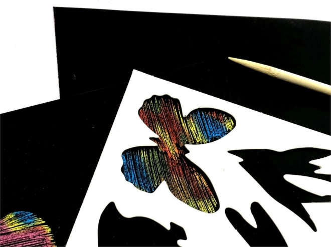 Ez a kreatív készlet remek választás kicsiknek és nagyoknak egyaránt. A papír fekete rétege színes, szivárványos alapot rejt, amely a mellékelt fa stylussal történő kaparással tárul fel. A sablonoknak köszönhetően könnyedén készíthetsz tiszta formákat és dekorációkat – vagy belefoghatssz a szabad alkotásba is.