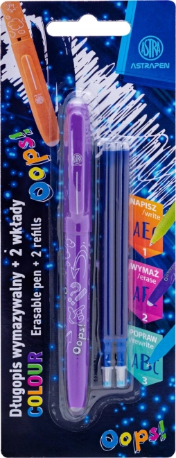 A praktikus, radírozható ASTRA OOPS! toll 0,6 mm-es finom vonalvastagsággal ideális iskolába és irodába egyaránt. Speciális tintát tartalmaz, amelyet a toll mindkét végével könnyen kiradírozhat, és ergonomikus markolatának köszönhetően kényelmes írást biztosít fáradtság nélkül. A csomag tartalma 2 db tartalék betét a hosszabb élettartamért.