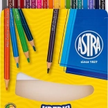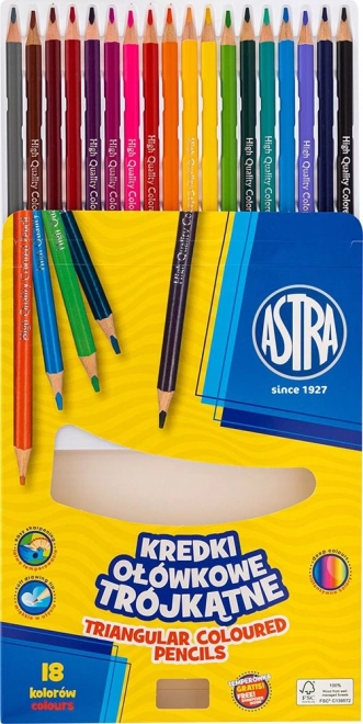 A kiváló minőségű, háromszögletű ASTRA színesceruza-készlet 18 színnel gyerekeknek és felnőtteknek egyaránt örömet okoz. Intenzív, tiszta színeket kínál, lágy rajzolású, nem porzik és nem maszatolódik. Az ergonomikus háromszög forma helyes ceruzafogást támogat jobb- és balkezeseknek is, a csomag része egy praktikus hegyező.