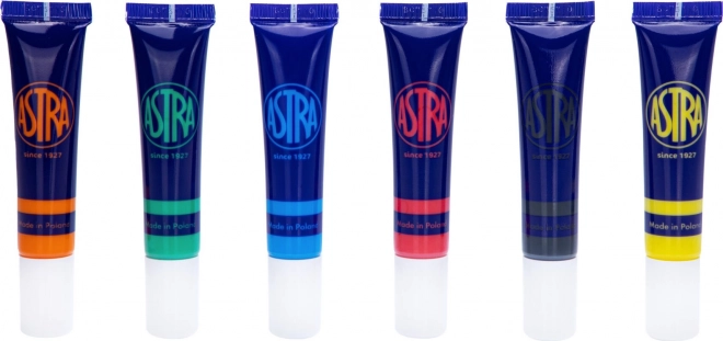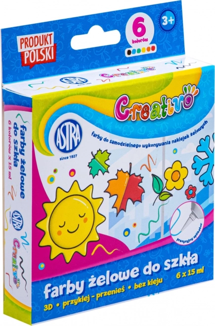 Az ASTRA CREATIVO zselés festékek üvegfestéshez és dekoráláshoz, sima felületekre. Száradás után áthelyezhető zselés matrica jön létre, amely ragasztó nélkül tapad üveghez, porcelánhoz, tükrökhöz, kerámialapokhoz és műanyagokhoz. Praktikus 6×15 ml-es készlet kreatív alkotáshoz.