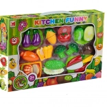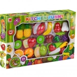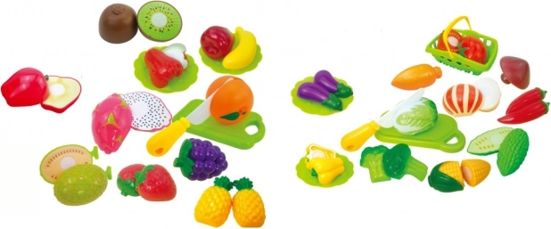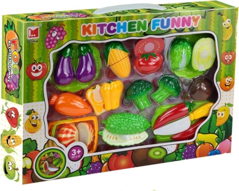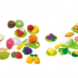 Szórakoztató és oktató jellegű, strapabíró műanyagból készült gyümölcs- és zöldségszeletelő készlet, amely segít a gyerekeknek gyakorolni a finommotorikát, az élelmiszerek felismerését és a biztonságos munkavégzést a gyerekkonyhában. Minden darab két részből áll, amelyeket tépőzár kapcsol össze, így biztonságos műanyag késsel újra és újra „felvághatók”. A készlethez vágódeszka is tartozik a még élethűbb főzős játékhoz.