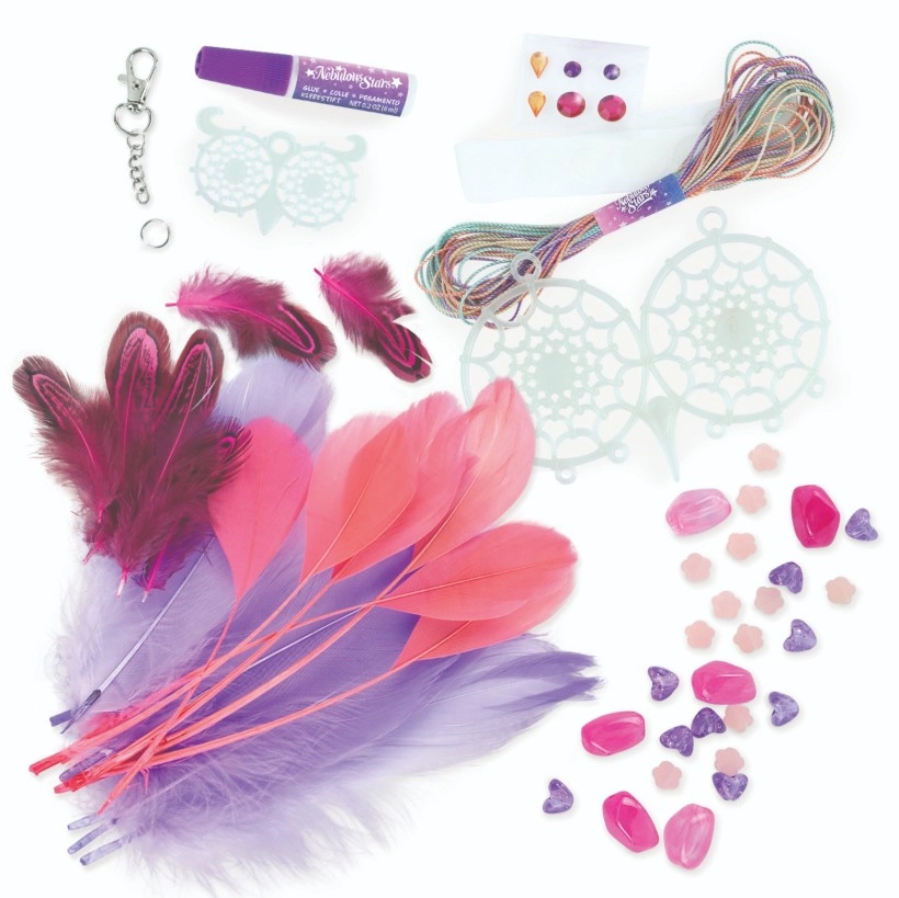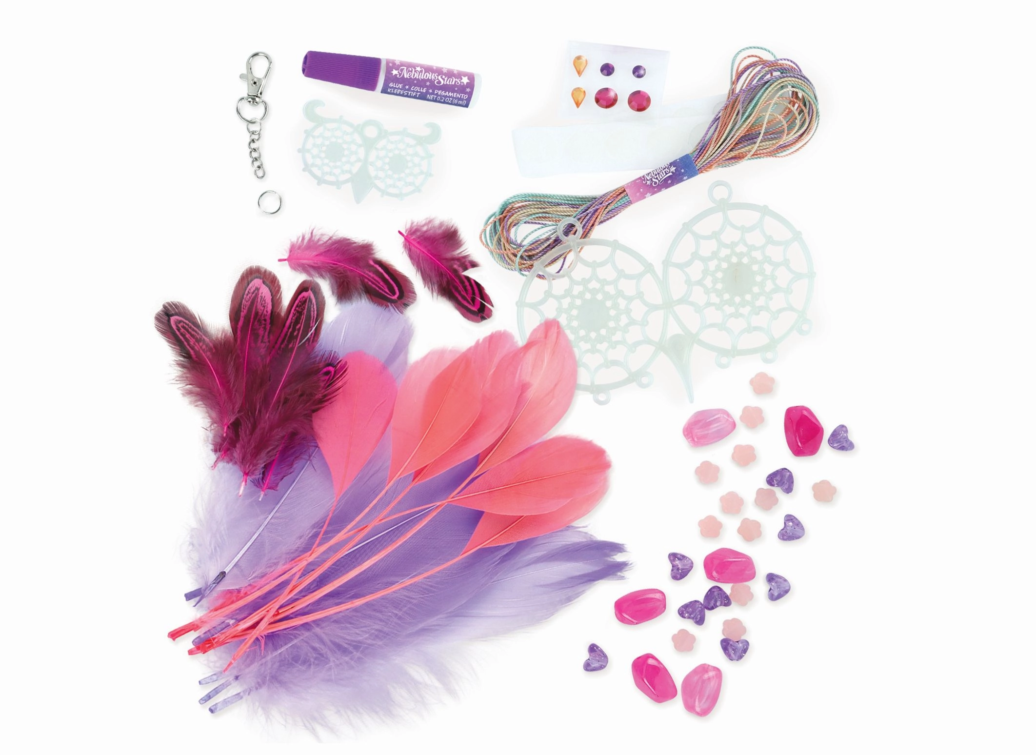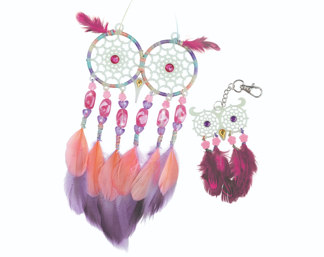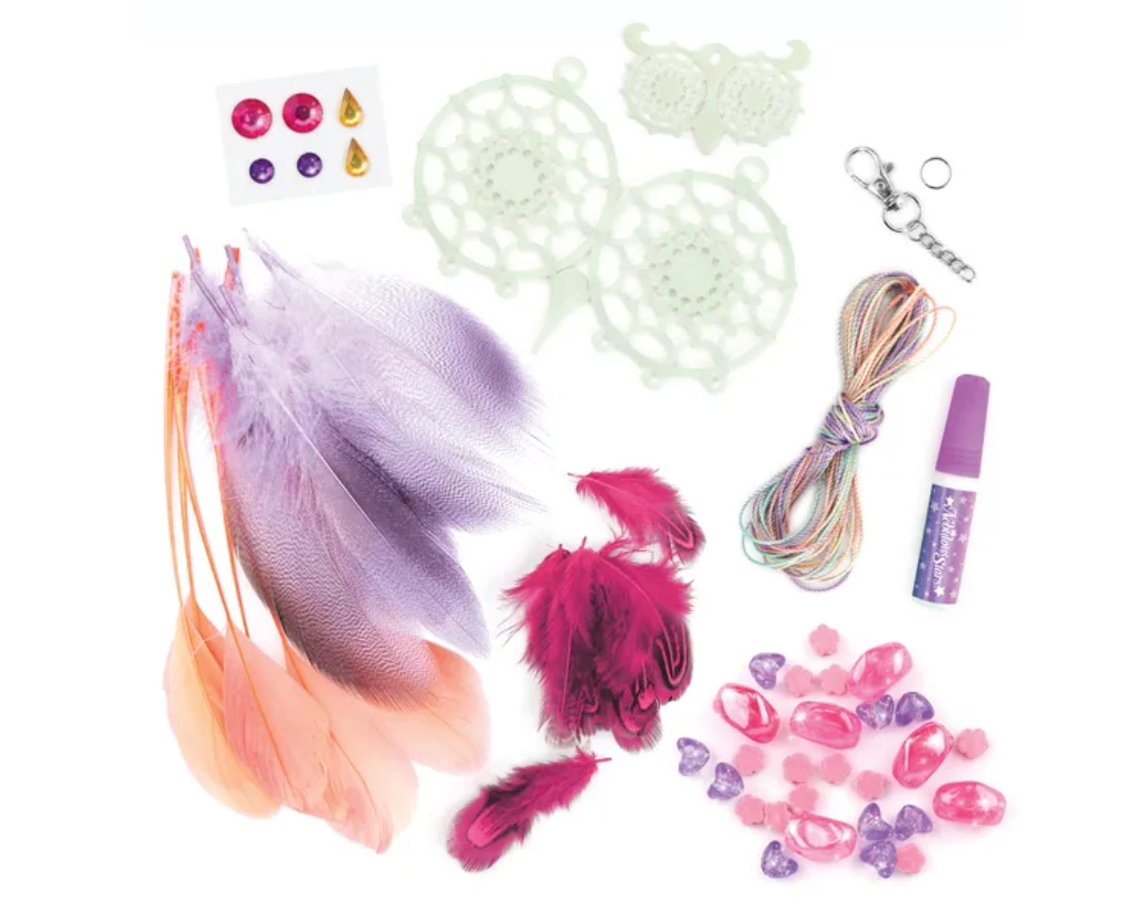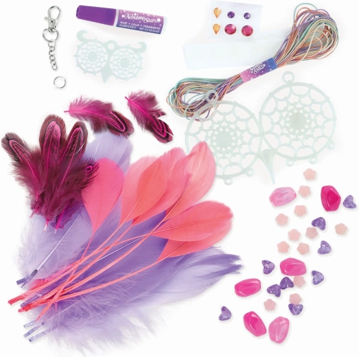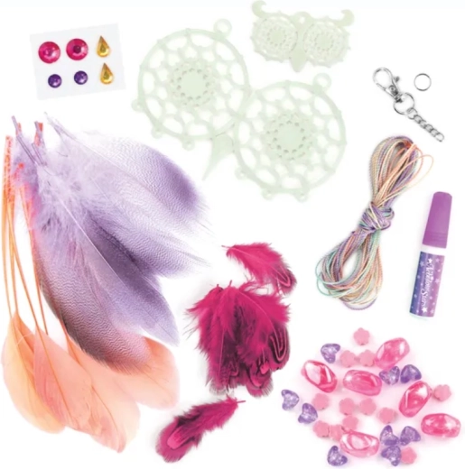 A csomag tartalma: 2 sötétben világító álomfogó-alap, pamutfonalak, 28 toll, 28 stílusos gyöngy, 6 ragasztható strassz és ékszerragasztó.