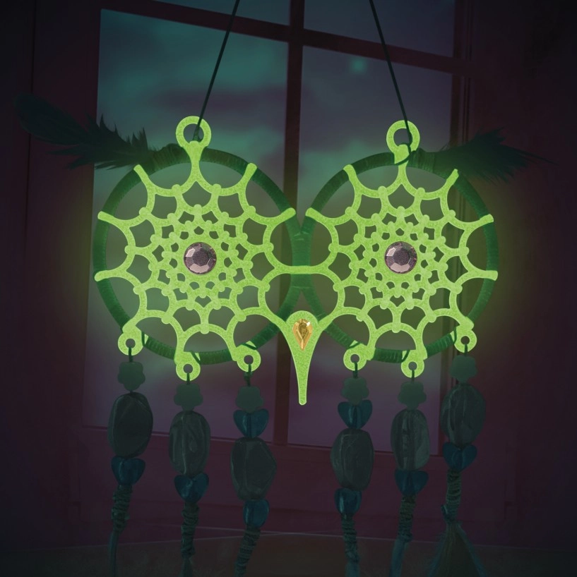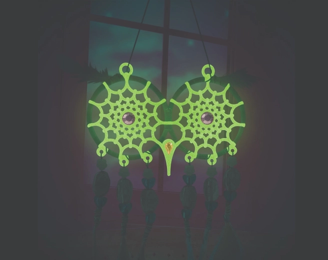 Az álomfogó speciális anyagai fény hatására feltöltődnek és finoman világítanak, így éjszaka megnyugtató fényhatást és egyedi szobadíszt teremtenek.