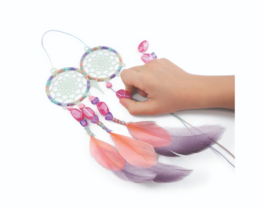 Az egyszerű fonalfűzés, gyöngyfűzés és tollas díszítés a 7 évesnél idősebb gyerekek számára is könnyen elvégezhető. Remek délutáni program vagy gyerekzsúr-tevékenység.