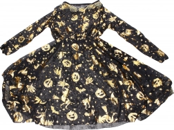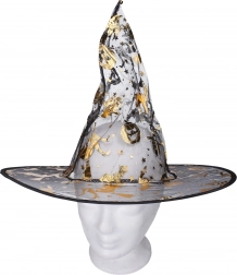 Elegáns karneváli boszorkány jelmez arany színben, ruhával és kalappal, ideális karneválra, jelmezbálra és Halloweenre. Elérhető S, M, L méretben.