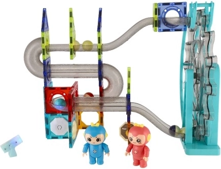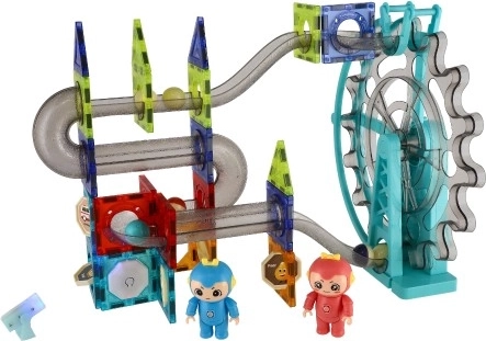 Ez a színes építőkészlet lehetővé teszi a gyerekek számára, hogy a mágneses elemeket könnyedén összekapcsolják, és egyedi golyópályákat hozzanak létre. Az útvonal megépítése után jön az izgalom – végiggurulnak a golyók a rajttól a célig? A biztonságos célba érésre a bájos Nink és Wink figurák is ügyelnek. A beépített elektromos kerék felvonóként működik a golyók számára, és fény- valamint hangeffekteket ad hozzá, amelyek igény szerint kikapcsolhatók.