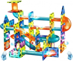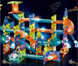 Ez a világító golyópálya mágneses blokkokat és átlátszó elemeket ötvöz LED világítással, így a gurulások sötétben is látványosak. A gyerekek rámpákat, hurkokat és akadályokat építhetnek, tetszés szerint kombinálva őket. Az erős mágnesek és reteszek stabil 3D konstrukciókat tesznek lehetővé, amelyeken a golyók megállás nélkül száguldanak.